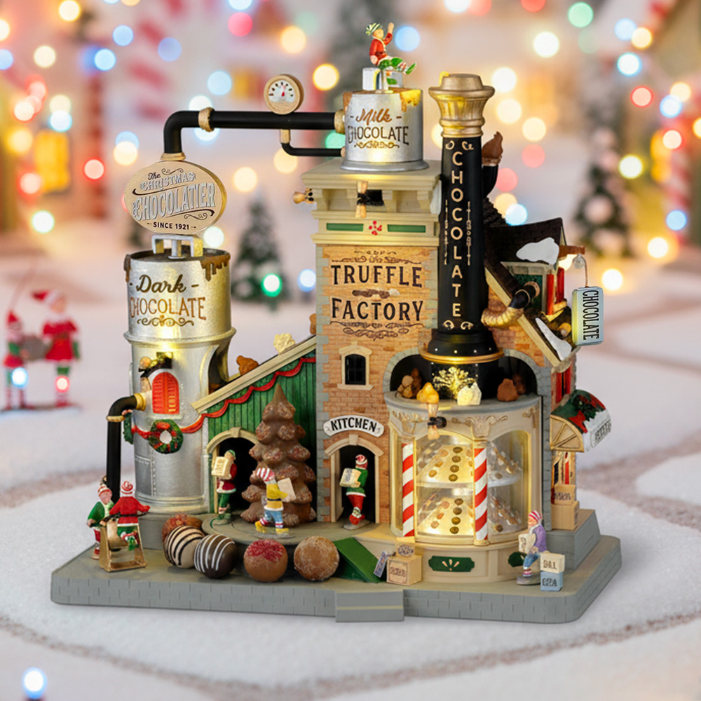 La Christmas Chocolatier Truffle Factory Lemax (codice 15805) è il luogo dei sogni per tutti i golosi: una fabbrica natalizia dove gli elfi lavorano instancabilmente per produrre deliziosi tartufi al cioccolato che profumano l’aria di dolcezza.