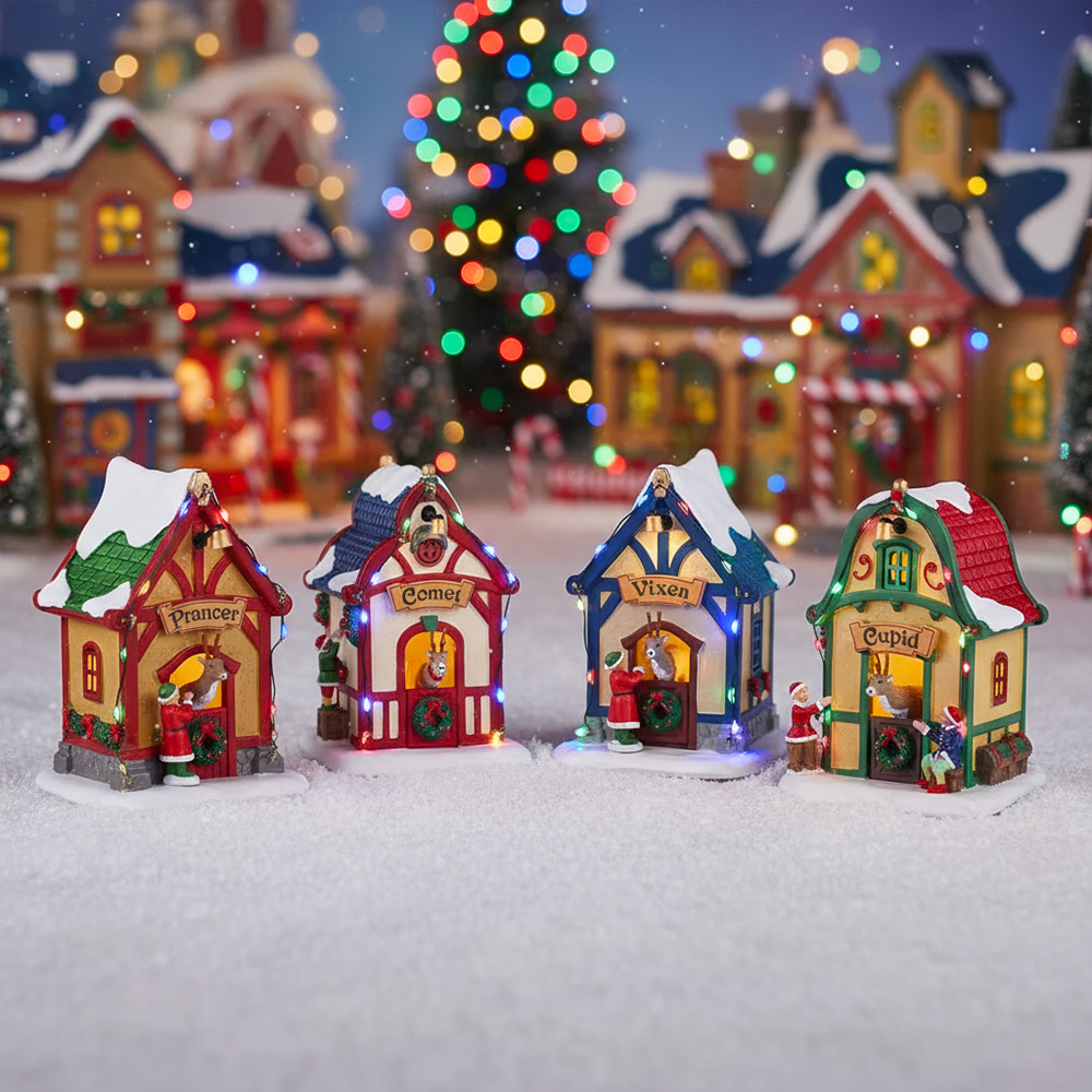 Le luci LED integrate rendono la scena ancora più suggestiva, perfetta per dare vita a un villaggio dove ogni renna di Babbo Natale ha la sua casa.