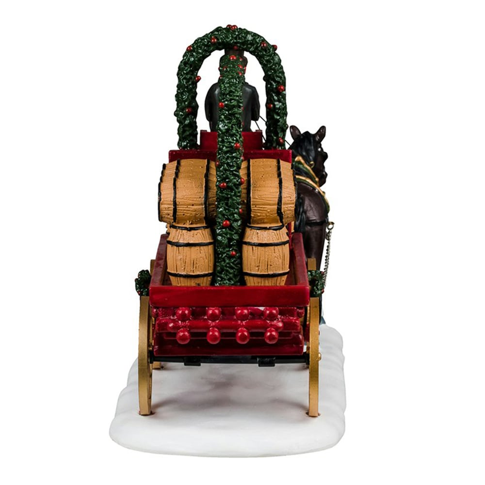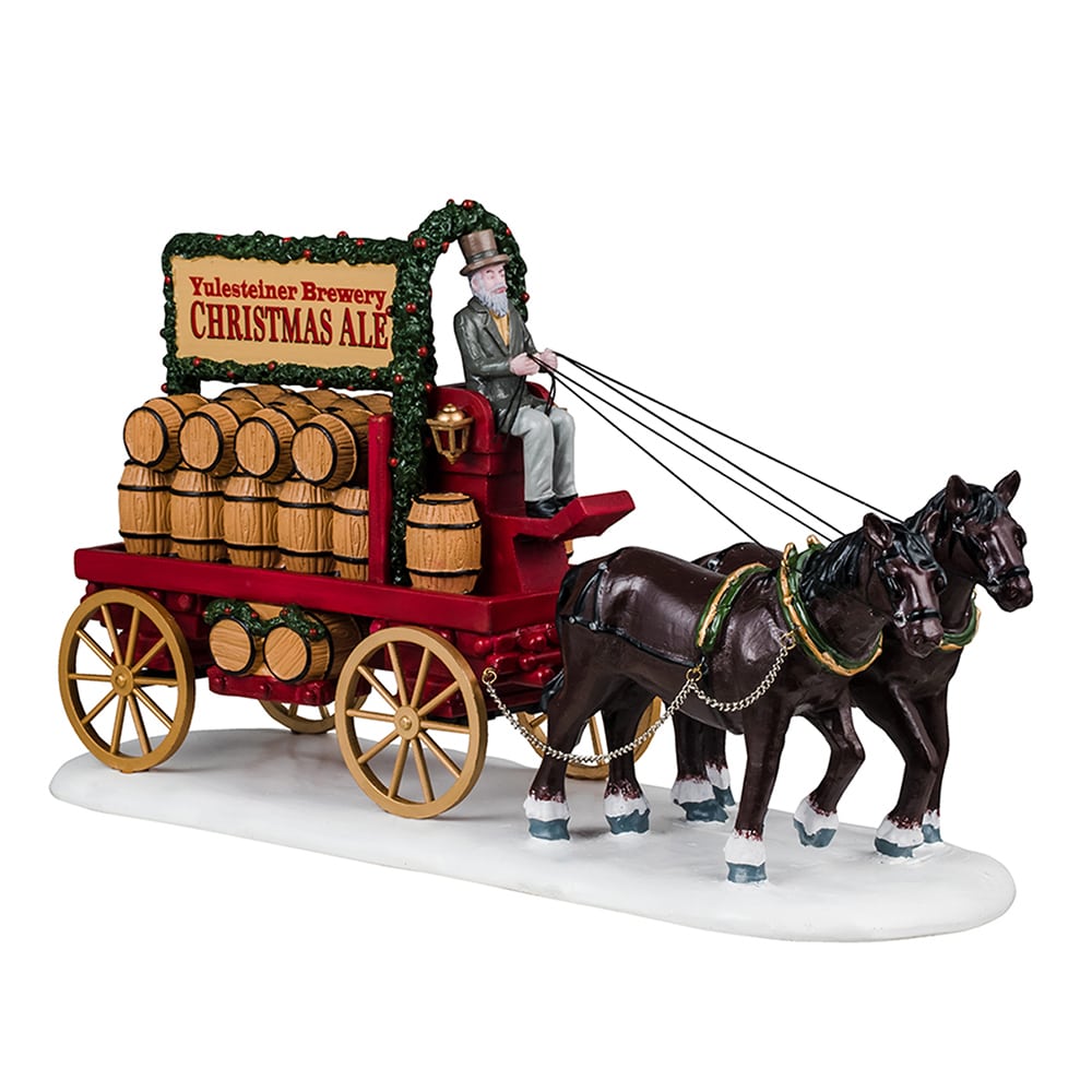 Tra fiocchi di neve che volteggiano leggeri e il canto lontano dei cori natalizi, un uomo allegro e vestito a festa guida una carrozza trainata da cavalli carica di botti di birra natalizia, direttamente dalla rinomata Yulesteiner Brewery. Il ritmo degli zoccoli, lo sferragliare delle ruote sulla neve compatta, il bagliore delle decorazioni che adornano il carro: ogni dettaglio richiama la gioia delle feste, il calore condiviso e l’euforia natalizia. Un elemento scenografico perfetto per dare vita al tuo villaggio Lemax.